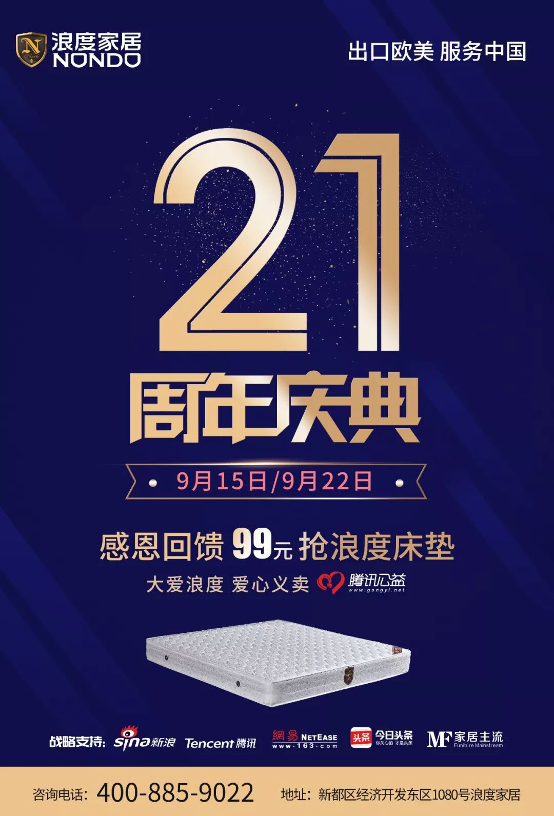 浪度辉煌21载,离不开新老客户的大力支持,唯有以优质优价的产品及贴心的服务回馈一直以来支持浪度的消费者!99元抢床垫,10000张床垫等你抢!9月15日、22日两个周末,嗨翻工厂!点击阅读原文了解活动详情。